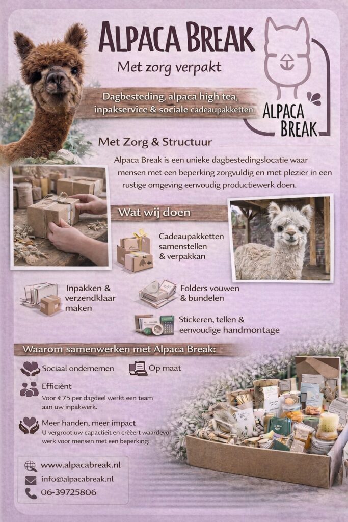 Alpaca Break is een zorginitiatief en dagbesteding waar mensen met een beperking werken in een veilige, rustige en betekenisvolle omgeving.
